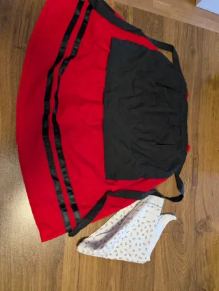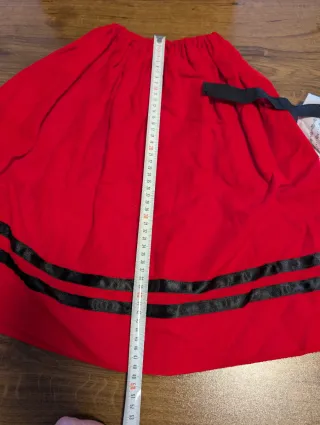 Conjunto de falda y delantal de estilo baserritarra, ideal para Olentzero. Con pañuelo. Tres prendas. - Falda roja con cintas negras. - Delantal negro. - Pañuelo blanco con estampado floral. La falda tiene 6 cm de dobladillo pero no recomiendo soltarlo.