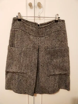 Falda de invierno con un diseño de espiga en blanco y negro. Tejido grueso. Bolsillos grandes. Se cierra detrás, con cremallera invisible. Por debajo de la rodilla.