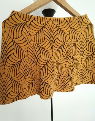 Falda corta con un llamativo estampado de inspiración africana en tonos mostaza y negro. Su diseño es ligero y con caída. - Tejido con estampado de hojas estilizadas. - Cintura elástica para mayor comodidad.