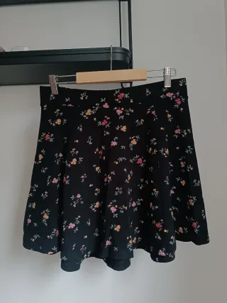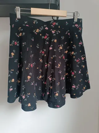 Falda corta negra con un bonito estampado floral. - Diseño con flores multicolores. - Cintura elástica para mayor comodidad.