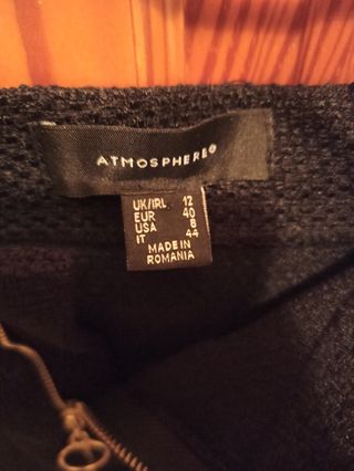 Preciosa falda negra de Atmosphere, talla 40. Es una falda de tejido tipo tweed, con cierre de cremallera y bolsillos. Está en muy buen estado. - Tejido tipo tweed. - Cierre de cremallera. - Bolsillos funcionales.
