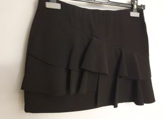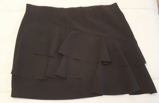 Falda ajustada elástica negra con volantes en la parte delantera que le dan un toque muy bonito y original, y lisa en la parte trasera. Queda muy favorecedora puesta.