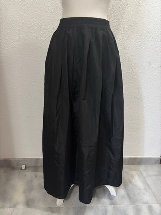 Falda-pantalón de Zara en negra, en perfecto estado, muy poco usada y de una calidad buenísima. La parte delantera es falda con una rajita y debajo el pantalón y la trasera es pantalón. Cierre lateral con cremallera, mucho cuerpo y una cintura en brillo que le da mucha clase.