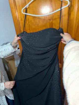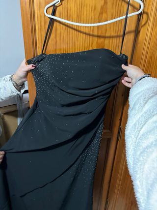 Elegante vestido negro con escote palabra de honor. - Detalle de pedrería en el corpiño y la falda. - Diseño drapeado. - Tirantes finos. - pañuelo de brillitos compañero