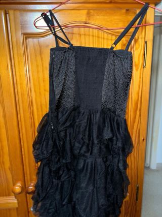 Vestido corto con un diseño elegante y femenino. Perfecto para ocasiones especiales. - Cuerpo del vestido con textura. - Falda con múltiples volantes de tul. - Tirantes finos ajustables.
