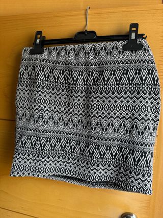 Falda corta con un llamativo estampado geométrico en blanco y negro. Su diseño la hace versátil para diferentes ocasiones. - Diseño de corte recto. - Cintura elástica para mayor comodidad. - Tejido con patrón tribal.