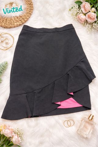 Falda midi negra con un diseño moderno y femenino. El detalle de volantes le da un toque especial. - Color: Negro - Forro interior: Rosa vibrante - Diseño: Asimétrico con volantes - Largo: Midi