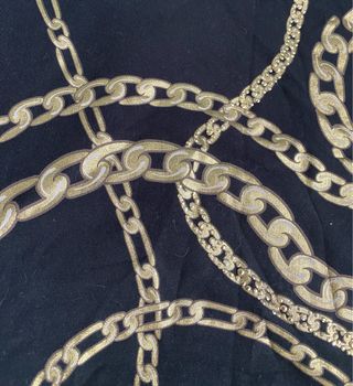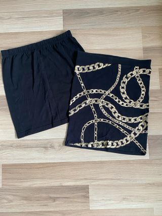 Dos minifaldas de algodón Una negra y otra negra con motivos en color dorado y brillos en la parte delantera Talla S