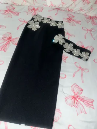 Elegante conjunto de top y falda adornado con pedrería. - Diseño con flores de pedrería. - Color negro con detalles plateados.