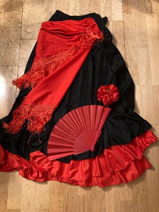 Conjunto de disfraz de sevillana con falda y accesorios. talla 16 años (niña XL) - Falda larga negra con volantes rojos. - Chal o mantón rojo con flecos. - Abanico rojo. - Flor roja para el pelo.