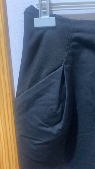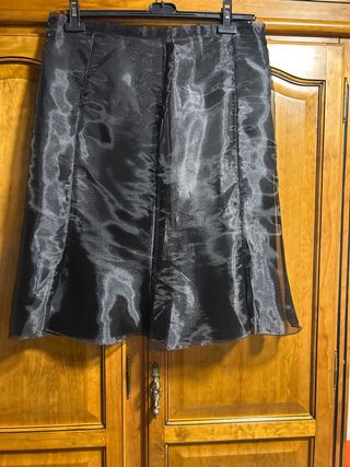 Falda negra, ajustable en la cintura ya que se ciñe, a la piernas y cintura, muy elegante para cualquier evento. Combina con todo. Llega hasta la rodilla, yo tengo una talla XL y me queda perfecta pero sirve tanto para talla L o XL. IMPECABLE