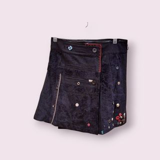 Preciosa minifalda de la marca Desigual, en color negro. Es una prenda única y llamativa. - Diseño asimétrico. - Detalle de botones decorativos. - Tejido con textura.