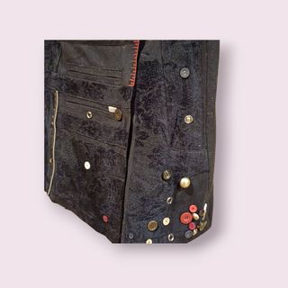 Elegante chaqueta con un estampado dorado y negro. Preciosa con falda negra de volantes. Es un S pero Miguel Gil talla grande, por lo que es más bien una 42. - Diseño de un solo botón. - Bolsillos frontales. - Forro interior negro.