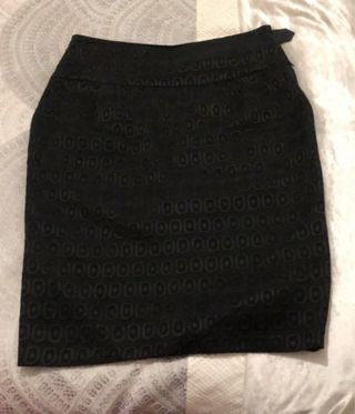 - Falda formal de Alba Conde en color negro - Diseño sútil con estampado de círculos. - No está muy usado y está en perfectas condiciones. - Llega hasta las rodillas - Talla 42