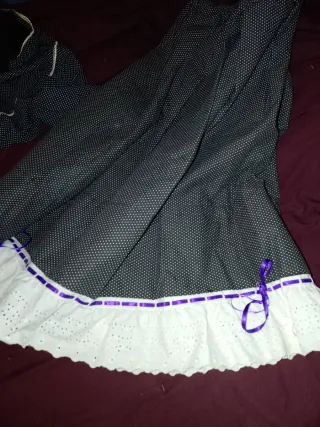 Conjunto de traje de casera con estampado de lunares. - Blusa con cuello blanco. - Falda con delantal negro satinado. - Adorno de encaje blanco en el bajo de la falda.