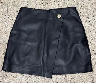 Falda corta con diseño cruzado y detalle de botón dorado. - Material: Cuero sintético. - Cierre: Botón y cremallera oculta. - Diseño: Cruzado asimétrico. - Detalle: Botón dorado decorativo.
