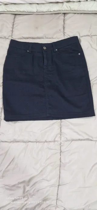 Falda de tubo corta con bolsillos en la cadera que tienen un detalle metálico. Medidas: 45 cm de ancho en la cintura, 57 cm de ancho en la cadera, 50 cm de largo.