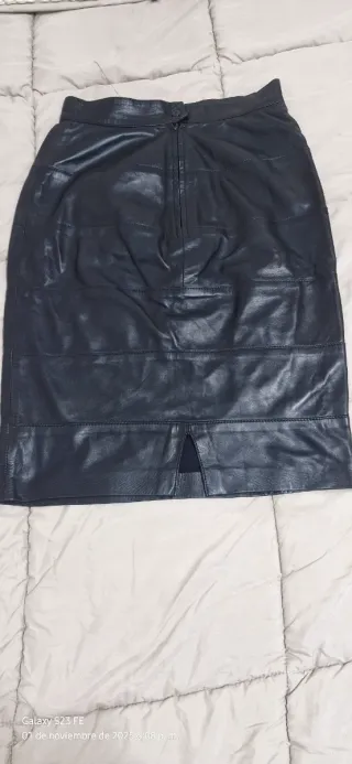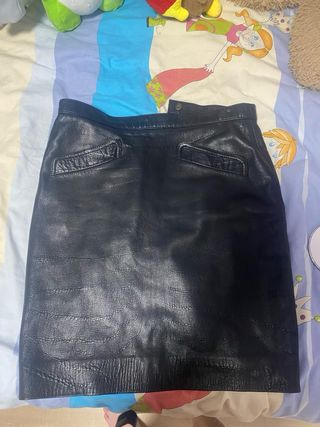 Falda de cuero con un diseño clásico y elegante. - Material: Cuero - Cierre de cremallera y botón - Abertura frontal talla exacta 46