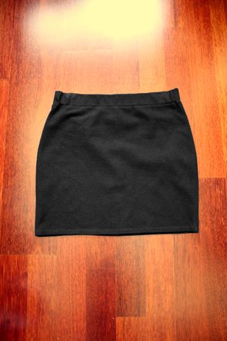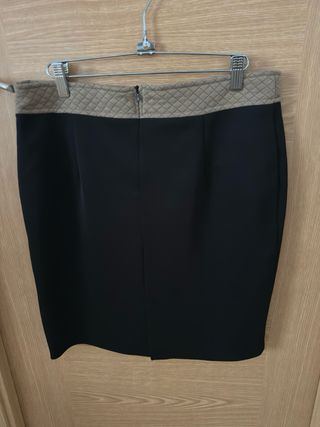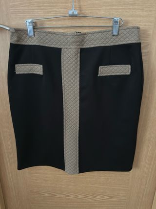 Falda por encima de la rodilla comprada en Promod. Costó alrededor de 15€ en rebajas. Se vende porque no se utiliza. Está en buen estado. Texturizada como se ve en la última foto. Talla L. Medidas aproximadas: de lado a lado de la cintura 42 cm y de largo 47 cm.
