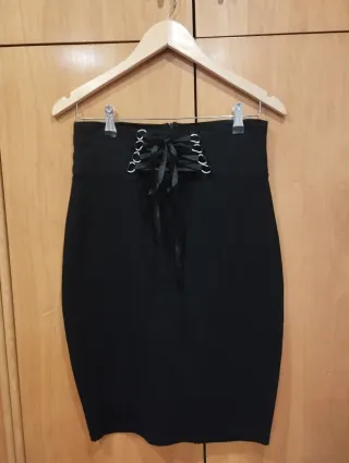 Falda de corte lápiz con detalle de lazada en la cintura. - Diseño de cintura alta. - Cierre con cordones y ojales metálicos. - Tejido liso.