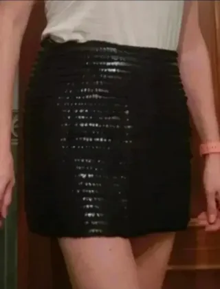 Minifalda negra de Zara, talla M (38/10). Es una falda elegante, ideal para ocasiones especiales. - Diseño con textura plisada. - Corte entallado. - Lleva cremallera, tiene 39 cm de largo.