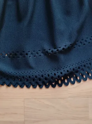 Falda corta de color negro con un diseño moderno y elegante. Perfecta para diversas ocasiones. - Cintura elástica. - Detalle de puntilla calada en el bajo. - Tejido con textura.