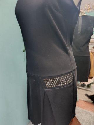 Vestido negro sin mangas con detalle de tachuelas en la cintura. - Diseño con tachuelas metálicas. - Falda con pliegues. Hombro 32 Pecho 100 Cintura 90 Cadera 95 Largo 85