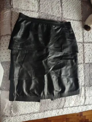 Falda vintage confeccionada en cuero. No me la he puesto nunca , me la regalaron y me queda pequeña - Diseño clasico, bonitos detalles por el corte de las piezas de cuero - Cintura con cremallera y automáticos , mide 35 cm - Corte amplio largo 75 cm - con forro