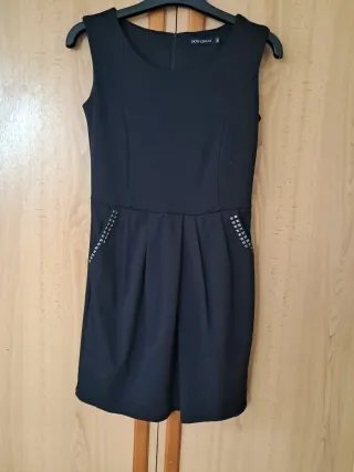Vestido negro ajustado cintura, con detalles en los bolsillos. - Diseño sin mangas. - Bolsillos delanteros con tachuelas plateadas. - Falda con pliegues.