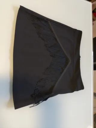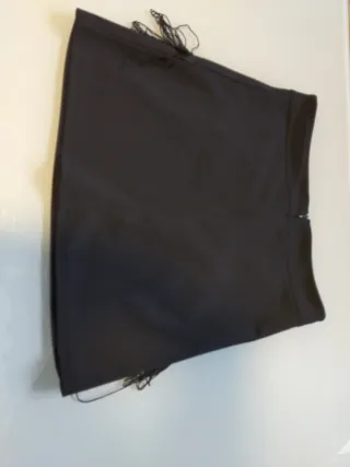 Falda corta de color negro con un diseño moderno. - Detalle de flecos en la parte delantera. - Corte moderno y favorecedor. - Cierre lateral talla S/M Nueva