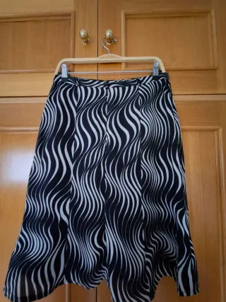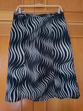 Falda con un llamativo estampado de ondas en blanco y negro. Su diseño la hace ideal para diversas ocasiones. - Diseño de ondas. - Corte favorecedor. - Tejido ligero. ****Pone Talla 48 pero no equivale a ese tallaje la medida de cintura es 39cm.****
