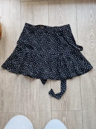 Falda corta con un divertido estampado de lunares blancos sobre fondo negro. Es una falda cruzada con un cinturón para anudar. - Diseño cruzado. - Cinturón para ajustar. - Estampado de lunares.