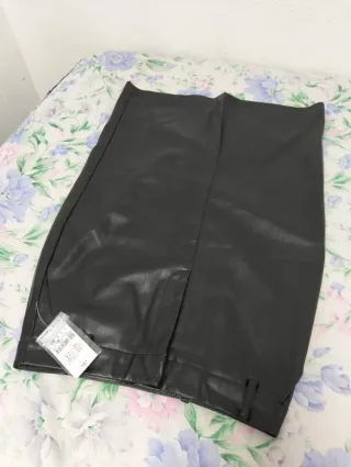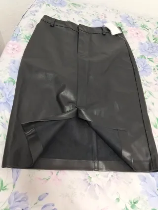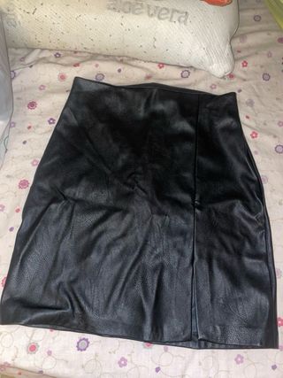 Falda de cuero sintético con un diseño moderno. - Material: Poliuretano. - Corte: Recto. - Detalle: Abertura frontal.