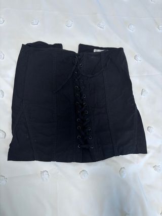 Falda de estilo corsé en color negro. Presenta un diseño moderno y favorecedor. - Cierre de cordones en la parte delantera. - Costuras detalladas que definen la silueta.