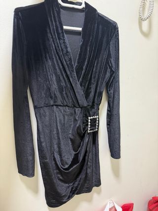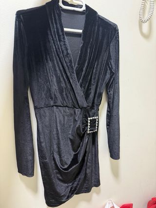 Elegante vestido de terciopelo con detalle de hebilla joya. - Diseño cruzado. - Manga larga. - Drapeado en la falda. - Hebilla decorativa con pedrería.