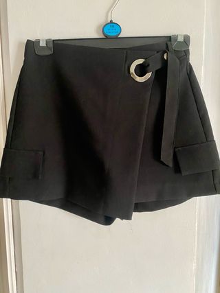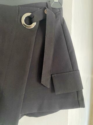 Falda pantalón de color negro con un diseño moderno. - Detalle de anilla metálica. - Cinturón a juego. - Bolsillos decorativos en los laterales. - Talla M.