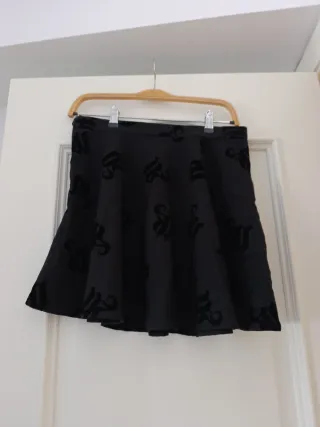 Falda corta con un diseño llamativo. - Estampado de letras en terciopelo. - Corte acampanado.