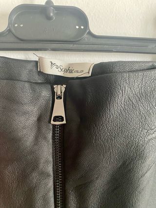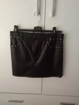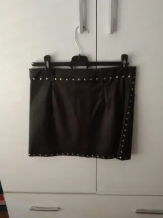 Falda corta de poliéster con un diseño moderno. - Detalle de tachuelas plateadas en el bajo y bolsillos. - Cintura con trabillas para cinturón. - Cierre de cremallera y botón. Con etiqueta,costo cerca de 50€