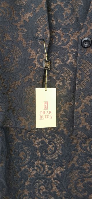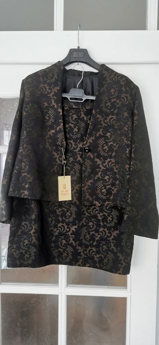 Conjunto de chaqueta y falda de señora sin estrenar, de marca Pilar Rueda, estampado con diseño Jacquard en tonos negro y marrón imitando encaje, en talla 52 y apertura trasera en la falda. Contiene etiqueta y percha original