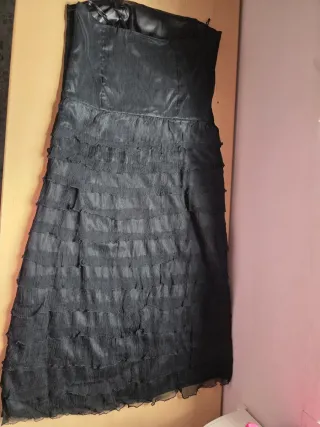 Vestido negro corto con un diseño de volantes en cascada. - Diseño sin tirantes. - Tejido con textura vertical en el corpiño. - Falda con múltiples capas de volantes. - Acabado con borde festoneado.