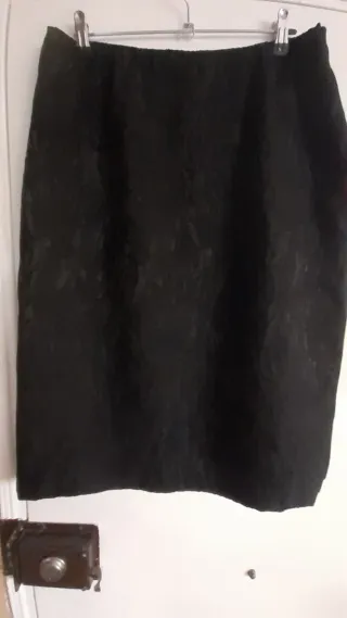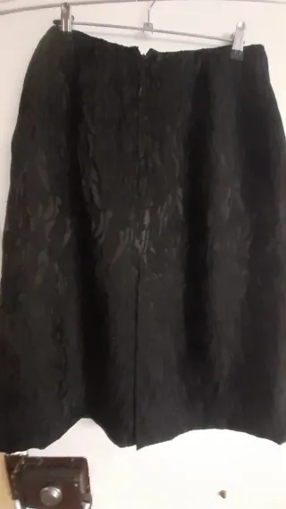 Elegante falda negra confeccionada por modista de alta costura. Tela negra con brocado (relieve) en seda. - Diseño con textura. - Largura bajo la rodilla (midi). - Con forro en negro. - Apertura atrás con cremallera. - Sus costuras laterales y trasera permiten meter o sacar. Ideal para vestir elegante o una ocasión especial.