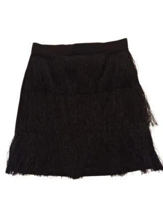 Falda corta con un diseño llamativo y festivo. - Detalle de flecos negros. - Capas de lentejuelas plateadas. - Estilo único y moderno.