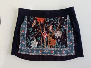 Falda ó minifalda color negro, con un estampado de pájaros y flore. Tiene forro y cierra con cremallera al costado.