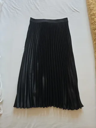 Preciosa falda negra plisada, ideal para cualquier ocasión. Es una prenda elegante y versátil. - Diseño plisado que le da un toque sofisticado. - Corte a la rodilla. - Tejido suave y de buena calidad.