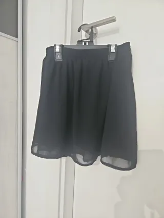 Falda corta negra de tela ligera y vaporosa. Lleva forro y no se transparente nada. - Diseño con vuelo. - Cintura elástica.
