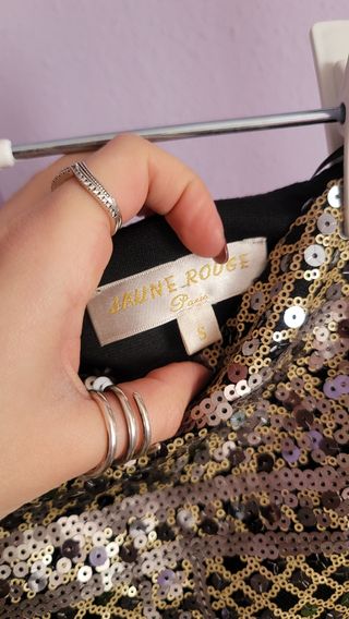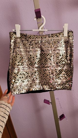 Falda de tubo con la parte trasera en negro y lentejuelas doradas en la parte delantera. Elástica, ralla S. Puesta una vez. Descuentos por la compra de varios artículos!😊