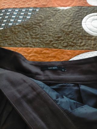 Dos faldas cortas. Una falda en tubo, en color marrón, con cierre de botones y con bolsillos delanteros. Talla 36. Medidas: Largo 41 cm y ancho 35 cm. Y otra falda skater, en color negro y blanco con estampado de circulos, de tela y cierre con cremallera en un lateral. Talla 36. Medidas: Largo 44 cm. y ancho 35 cm. Por separado valen 7 €, cada una.