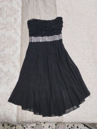 Elegante vestido negro sin tirantes, perfecto para ocasiones especiales. Presenta un detalle de pedrería en la cintura que añade un toque de brillo. - Diseño sin tirantes. - Cintura adornada con pedrería. - Falda con vuelo.