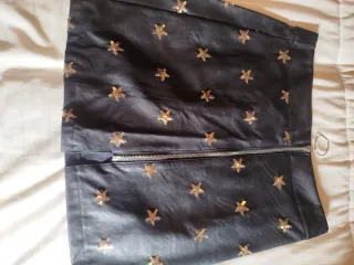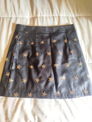 Falda corta de cuero sintético con un divertido estampado de estrellas doradas. - Detalle de lentejuelas en forma de estrella. Sin estrenar.