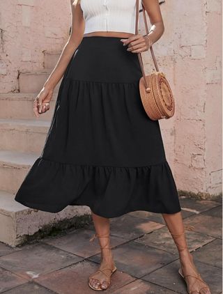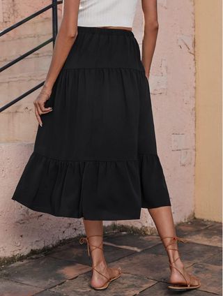 Vestido largo de Shein con un diseño elegante en negro y blanco. - Mangas abullonadas. - Falda plisada. - Detalle de volantes en la parte inferior.